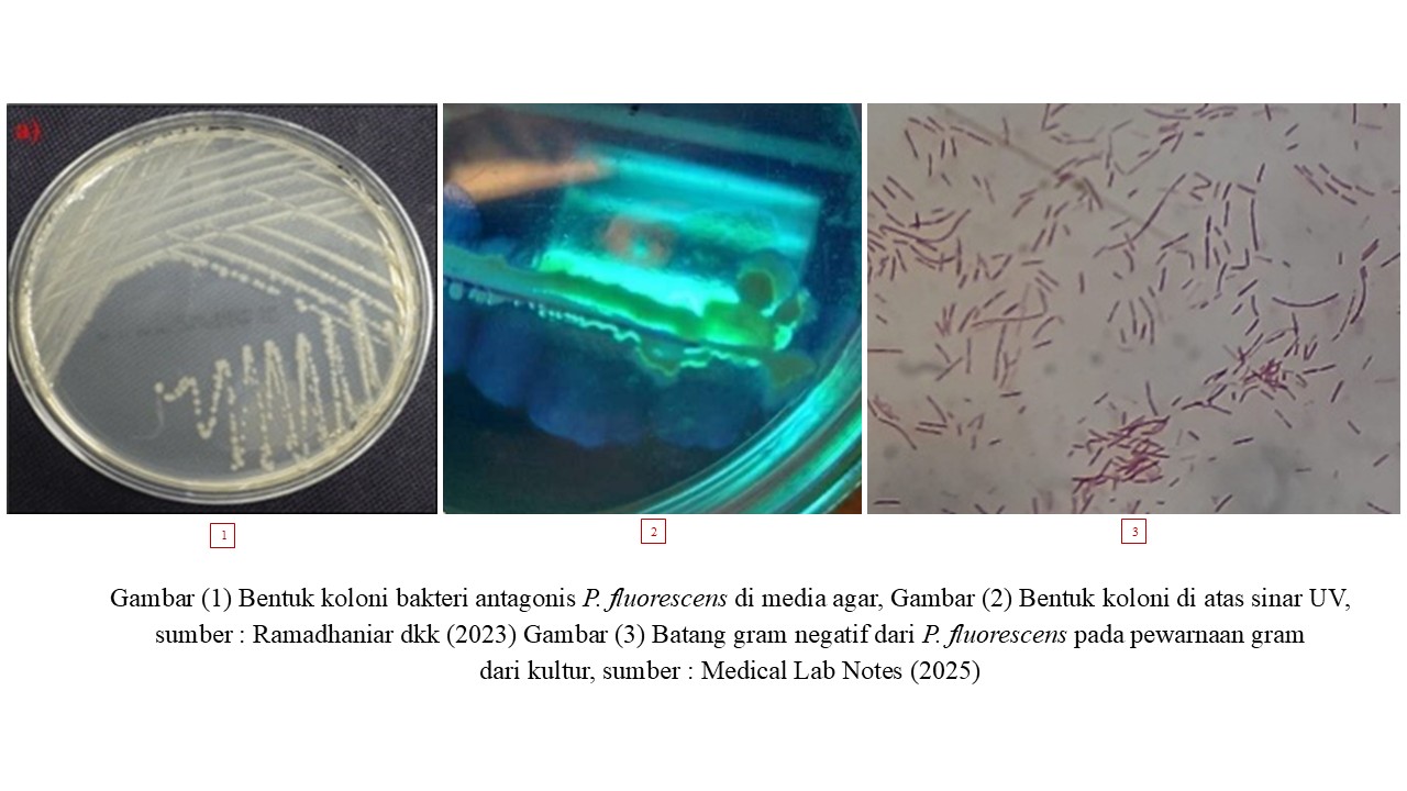 Berdasarkan penelitian Hanudin et al. (2009) bakteri P. flourescens yang diisolasi dari tempat berbeda memiliki kemampuan penghambatan yang berbeda-beda. Bakteri genus Pseudomonas menghasilkan senyawa antibiosis berupa pyoluteorin dan pyrrolnitrin yang bersifat toksik terhadap patogen. Senyawa tersebut merupakan salah satu senyawa antibiosis yang dapat merusak dinding sel, sehingga cairan yang ada di dalam dinding sel akan berkurang dan mengalami plasmolisis sehingga proses metabolisme akan terhambat. Selain itu berdasarkan penelitian Hassanein et al (2009), Pseudomonas sp. memiliki kemampuan untuk memproduksi metabolit sekunder seperti siderofor penghelat besi (Fe), amonia dan sianida. P. fluorescens merupakan salah satu bakteri bakteri yang dapat melarutkan fosfat terikat menjadi bentuk tersedia yang berguna untuk tanaman. Kemampuan bakteri ini melarutkan fosfat dengan terbentuknya zona bening. Menurut Probowati dkk. (2021), bakteri ini mempunyai sifat “Plant Growth Promoting Rhizobacteria” (PGPR), menghasilkan antibiotika 2,4- diasetilfloroglusinol (Phl atau DAPG) dan siderofor, mampu mengkoloni akar tanaman serta mengimbas ketahanan tanaman. P. fluorescens memiliki sifat antagonis terhadap patogen cendawan maupun bakteri. Beberapa contoh pemanfaatan bakteri antagonis ini yaitu mampu menekan penyakit hawar daun yang disebabkan oleh bakteri Xanthomonas sp. pada tanaman padi, mengendalikan penyakit layu Fusarium oxyporum pada gladiol, mengendalikan penyakit layu bakteri Ralstonia solanacearum pada tanaman pisang, tomat, cabai dan kentang serta masih banyak lagi.
