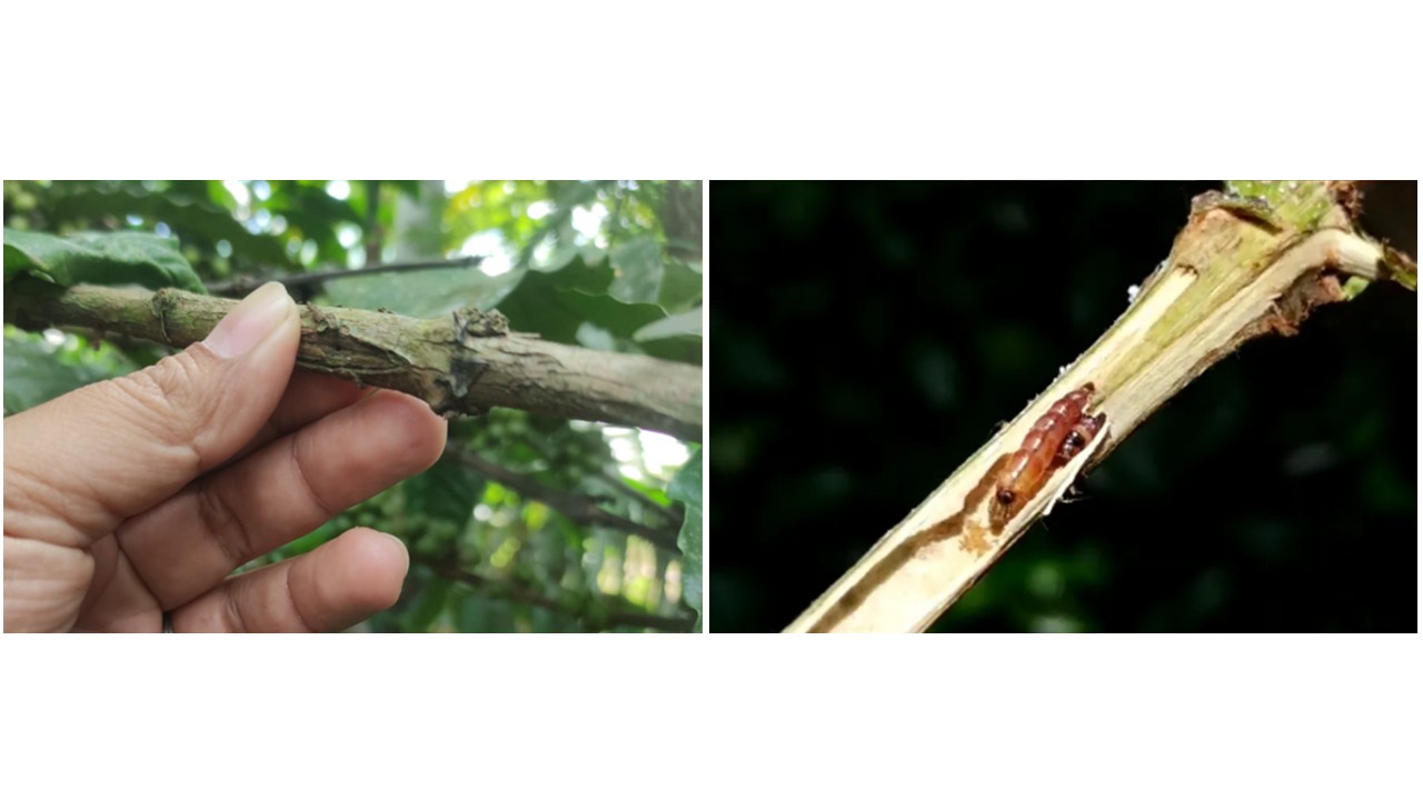 kopi yang terserang ditandai oleh adanya lubang kecil pada ranting atau cabang,