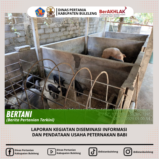 Dalam rangka meningkatkan pengetahuan dan pemahaman para peternak mengenai manajemen usaha peternakan babi yang baik dan berkelanjutan, Dinas Pertanian Kabupaten Buleleng melalui PPL Wilbin Pemaron melaksanakan kegiatan diseminasi informasi sekaligus pendataan usaha peternakan babi. (20/10)