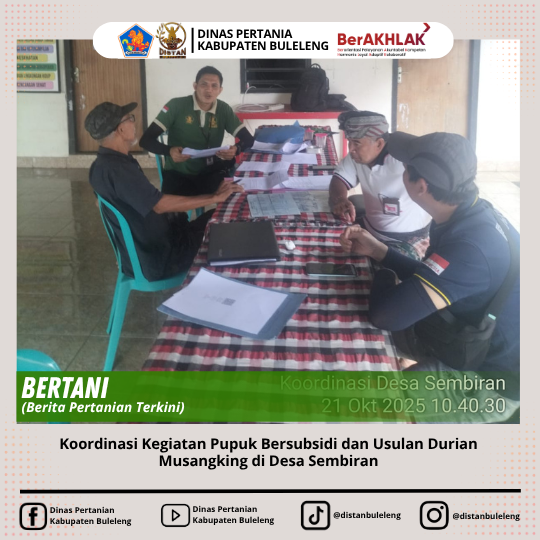 Pada hari Selasa, 21 Oktober 2025 bertempat di Kantor Desa Sembiran PPL Desa Sembiran melaksanakan koordinasi dengan Perbekel Sembiran dan Penggurus Subak Abian Tanah Daha Desa Sembiran terkait dengan usulan Pengamprahan Pupuk Subsidi dan kegiatan usulan Durian Musangking di Desa Sembiran. Koordinasi ini dilaksanakan dalam rangka untuk memastikan kegiatan pelaksanaan berjalan dengan baik