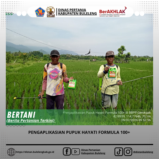 Senin, 9 Februari 2026, dalam rangka mendukung pemanfaatan lahan pertanian serta peningkatan produktivitas tanaman, telah dilaksanakan kegiatan pengaplikasian Pupuk Hayati Formula 100+ di Lahan Lokapaksa seluas 0,50 ha dan Lahan Balai Benih Pembantu Padi dan Palawija (BBPP) Gerokgak dengan luas 1 hektar.