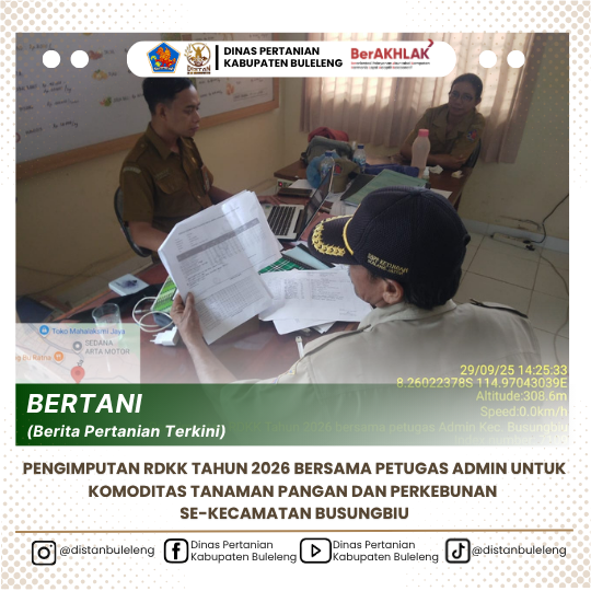 Menindaklanjuti program pupuk subsidi melalui zoom yang telah dilaksanakan sebelumnya, maka dengan ini petugas penyuluh pertanian yang memegang wilayah binaan dengan didampingi oleh masing masing petugas admin RDKK tingkat kecamatan melaksanakan pengimputan data, termasuk BPP Kecamatan Busungbiu, Kabupaten Buleleng. Pada hari ini Senin, 29 September 2025. Progres pengimputan berjalan secara bertahap setiap harinya sampai dengan tanggal 25 Oktober 2025 nanti.