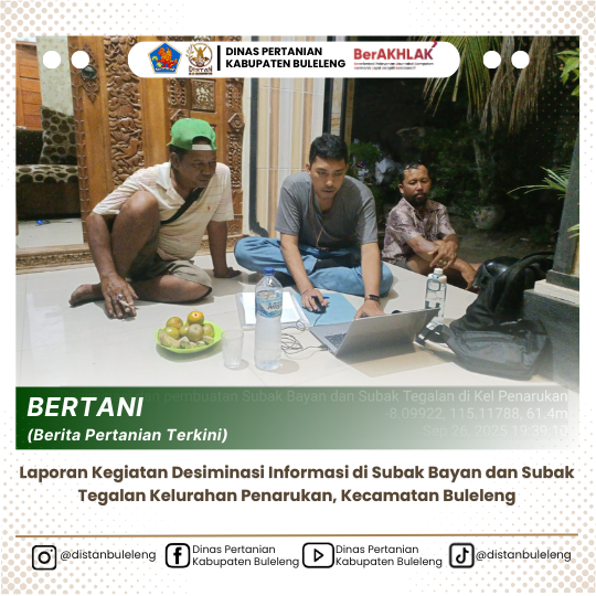Kegiatan desiminasi informasi dilaksanakan di Subak Bayan dan Subak Tegalan, Kelurahan Penarukan, Kecamatan Buleleng. Tujuan utama kegiatan ini adalah untuk menyampaikan informasi terkait progres pengajuan bantuan pemerintah (banpem) berupa proposal alat rice transplanter, penyusunan e-RDKK pupuk bersubsidi, serta pentingnya dokumentasi kegiatan subak. Dokumentasi sangat ditekankan karena kedua subak ini merupakan penerima bantuan benih pemerintah varietas Inpari 32, sehingga perlu pencatatan lengkap mulai dari penyerahan benih, pembenihan, proses tanam, hingga panen.