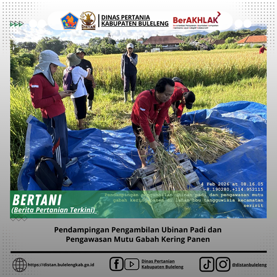 Bertempat di lahan BBU Tangguwisia, Subak Kaligenit, Kecamatan Seririt oleh kepala bidang tanaman pangan, kordinator popt kabupaten bulelenRabu, 4 Pebruari melaksanakan kegiatan :g, pmhp bidang tanaman pangan, plo bidang tanaman dan bidang penyuluhan, POPT Kec. Seririt. Luasan lahan 50 are yang ditanami padi varietas inpari 32. Rabu, 4 Pebruari 2025