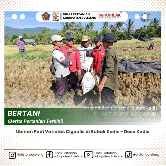Rabu, 1 Oktober 2025 telah dilaksanakan kegiatan pengambilan ubinan padi varietas Cigeulis di Subak Kedis. Kegiatan ini dilaksanakan oleh PPL Wilbin, petugas data, Kelian Subak dan petani pemilik lahan.