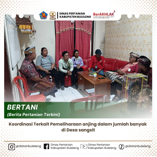 Dinas Pertanian Kabupaten Buleleng melalui Bidang Peternakan dan Kesehatan Hewan melaksanakan koordinasi dengan pemerintah Desa Sangsit terkait sosialisai dan koordinasi warga yang memelihara anjing dalam jumlah yang banyak. Kamis 04/09