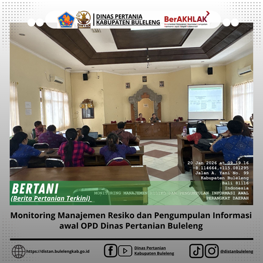 Selanjutnya Inspektur Pembantu II Inspektorat daerah Kabupaten Buleleng Devi Lindayani ,SH menyampaikan Hasil Monitoring Manajemen Resiko yang telah dilaksanakan oleh Dinas Pertanian Kabupaten Buleleng tahun anggaran 2025, dan didapat hasil bahwa Hasil Monitoring Manajemen Resiko yang telah dilaksanakan oleh Dinas Pertanian Kabupaten Buleleng tahun 2025 Paling Baik jika dibanding semua OPD diKabupaten Buleleng, Namun capaian yang baik ini hendaknya terus dipertahankan dan kedepan dapat di tingkatkan hal lain di berikan masukan agar di tahun 2026 ini Dinas Pertanian segera membuat Kertas Kerja untuk menentukan Resiko Prioritas yang bisa di intervensi serta mitigasi dan lanjut segera membuat FGD ( Fokus Group Discusion) serta kooridnasi atas konsep tersebut yang di fasilitasi oleh inspektorat sebelum ditetapkan menjadi Resiko Dinas Pertanian.