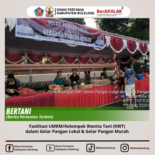 Minggu, 19 Oktober 2025 dilaksanakan Gelar Pangan Lokal & Gelar Pangan Murah di Jln Ngurai Rai Singaraja, area car free day. Acara ini diikuti oleh para pelaku usaha/UMKM dari berbagai wilayah di Kabupaten Buleleng termasuk UMKM/Kelompok Wanita Tani di Kecamatan Sukasada. Acara ini tentu memberikan dampak positif untuk pengembangan UMKM kedepannya.