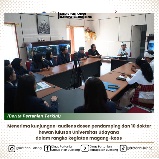 Kepala Dinas Pertanian Kabupaten Buleleng menerima kunjungan-audiens dosen pendamping dan 10 dokter hewan lulusan Universitas Udayana dalam rangka kegiatan magang-koas melalui aplikasi ilmu, memperoleh pengalaman klinis dan menjalin kerjasama serta pengabdian kepada masyarakat yang akan dilaksanakan di Kabupaten Buleleng selama 1 bulan melalui Dinas Pertanian Kabupaten Buleleng.
