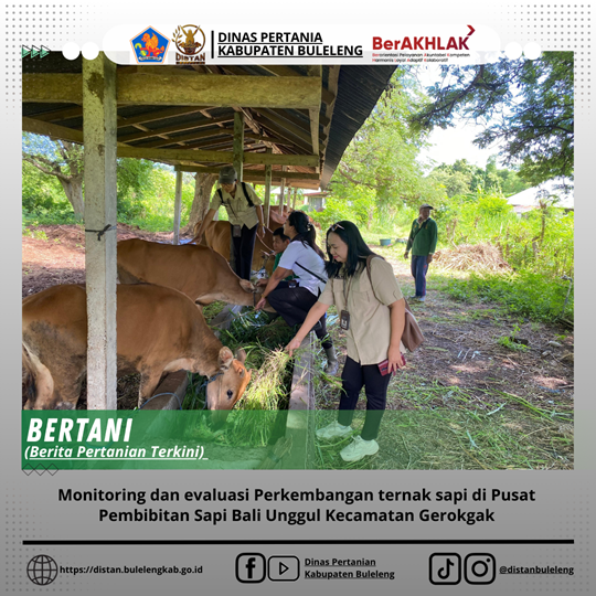 Pada hari ini, Rabu 4 Pebruari 2026, Pengawasan Sanitasi Uspet dan Kesmavet bersama Pengawas Bibit Ternak melaksanakan kegiatan monitoring dan evaluasi perkembangan ternak di Pusat Pembibitan Sapi Bali Unggul (PPSBU) yang berlokasi di Kecamatan Gerokgak, dengan didampingi oleh petugas.