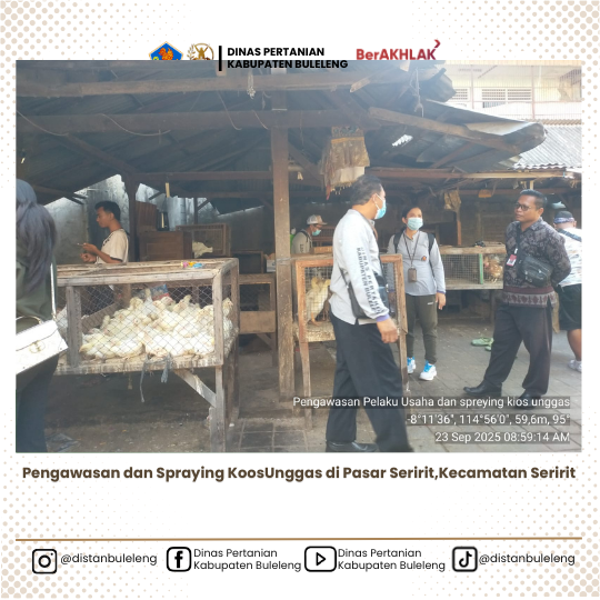 Pada hari ini, selasa 23 september 2025,Dinas Pertanian Kabupaten Buleleng melalui medik veteriner beserta staf Bidang Peternakan dan Kesehatan Hewan yang didukung mahasiswa PKL Fakultas Kedokteran Hewan Universitas Udayana (FKH UNUD), melaksanakan kegiatan pengawasan dan spraying kios unggas di Pasar Seririt, Kecamatan Seririt Kegiatan ini bertujuan untuk menjaga kebersihan, meningkatkan sanitasi kandang penampungan ayam sementara, serta memberikan Komunikasi, Informasi, dan Edukasi (KIE) kepada pemilik kios unggas.