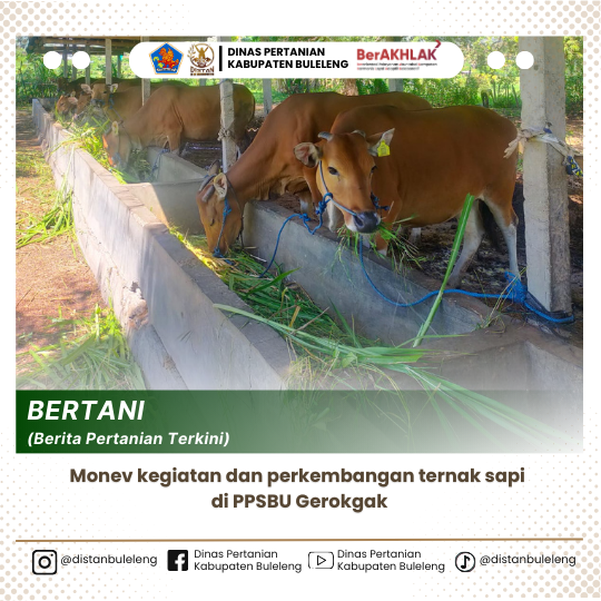 Bidang Peternakan dan Kesehatan Hewan melalui Pengawas Sanitasi Usaha Peternakan (Uspet) dan Kesehatan Masyarakat Veteriner (Kesmavet) bersama Pengawas Bibit Ternak Dinas Pertanian Kabupaten Buleleng melaksanakan kegiatan monitoring dan evaluasi (Monev) terhadap perkembangan ternak sapi di Pusat Pembibitan Sapi Bali Unggul (PPSBU) Gerokgak.
