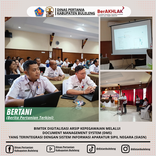 Pada hari ini, Rabu 26 November 2025, Staff Kepegawaian menghadiri kegiatan Bimtek Digitalisasi Arsip Kepegawaian Melalui Document Management System (DMS) bertempat di Hotel Aneka Lovina Villas & Spa Bali. Kegiatan ini dilaksanakan oleh BKPSDM selama 2 hari (25-26 November 2025) yang dihadiri oleh perwakilan staf kepegawaian dari seluruh SKPD lingkup Kabupaten Buleleng dan BKN Regional X sebagai narasumber. Dinas Pertanian mendapatkan jadwal untuk mengikuti kegiatan Bimtek ini pada tanggal 26 November 2025.