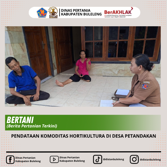 Terkait hal tersebut maka PPL Desa Petandakan melaksanakan koordinasi dengan beberapa petani dan juga kelian subak untuk mendata komoditas hortikultura yang ada di Desa Petandakan. Hasil koordinasi tersebut kemudian dilanjutkan dengan kunjungan langsung ke kebun tempat komoditas hortikultura tersebut dibudidayakan. Adapun hasil dari pendataan tersebut adalah bahwa komoditas hortikultura yang paling banyak dibudidayakan saat ini adalah tanaman durian, dimana kebun yang dimiliki petani didominasi oleh tanaman durian dengan jumlah bervarisasi antara 10 sd 50 pohon dengan sistem tumpeng sari dengan tanaman hortikultura yang lain seperti rambutan, mangga, manggis, alpukat, pisang dan juga komoditas perkebunan yaitu cengkeh.