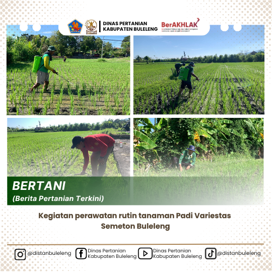 Kegiatan perawatan rutin tanaman padi variestas semeton buleleng di lahan BBU Tangguwisia Kegiatan ini bertujuan untuk menjaga pertumbuhan tanaman padi agar optimal dan terbebas dari gangguan gulma yang dapat menghambat produktivitas.