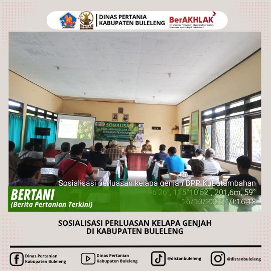 Bidang Perkebunan Dinas Pertanian Kab. Buleleng melaksanakan kegiatan Sosialisasi Perluasan Kelapa Genjah di Kabupaten Buleleng yang dilaksanakan di BPP Kubutambahan. Sosialisasi dihadiri oleh Kabid Perkebunan Dinas Pertanian dan Ketahanan Pangan Propinsi Bali, Kabid Perkebunan Dinas Pertanian Kab. Buleleng, Koordinator BPP Kubutambahan, PPL Wilbin, POPT Kec. Kubutambahan dan para ketua kelompok penerima bantuan. Kegiatan sosialisasi ini difasilitasi oleh Koordinator BPP Kecamatan Kubutambahan sbg moderator.