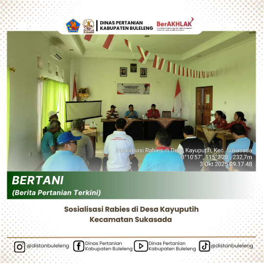Jumat, 3 Oktober 2025 dilaksanakan sosialisasi rabies di aula Kantor Desa Kayuputih, Kecamatan Sukasada. Hadir sebagai nara sumber, Dokter Hewan Kecamatan dan PPL Wilbin sebagai pendamping. Turut hadir Ketua BPD, Ketua LPM, Babinkamtibmas, dan Kelian Banjar Dinas.