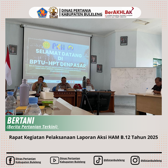Pada hari ini, Selasa tanggal 2 Desember 2025, Kepala Bidang Peternakan dan Kesehatan Hewan bersama Pengawas Bibit Ternak Dinas Pertanian Kabupaten Buleleng menghadiri Rapat Undangan Peserta Pertemuan Uji Performans yang diselenggarakan oleh BPTU–HPT Denpasar. Kegiatan ini berlangsung di Aula Breeding Center Pulukan, BPTU–HPT Denpasar yang berlokasi di Kabupaten Jembrana.