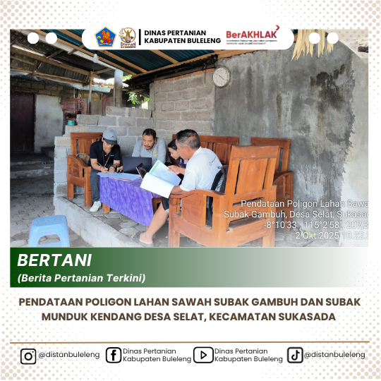 Kamis, 2 Oktober 2025 dilaksanakan pendataan poligon lahan sawah Subak Gambuh dan Subak Munduk Kendang, Desa Selat Kecamatan Sukasada. Pemetaan poligon adalah proses digitalisasi batas fisik lahan sawah yang membentuk area tertutup (poligon) pada peta digital, menggunakan aplikasi seperti Google Earth atau platform GIS, serta input data atribut seperti luas dan kepemilikan lahan untuk pembaruan dan pengelolaan data lahan pertanian yang akurat dan terintegrasi