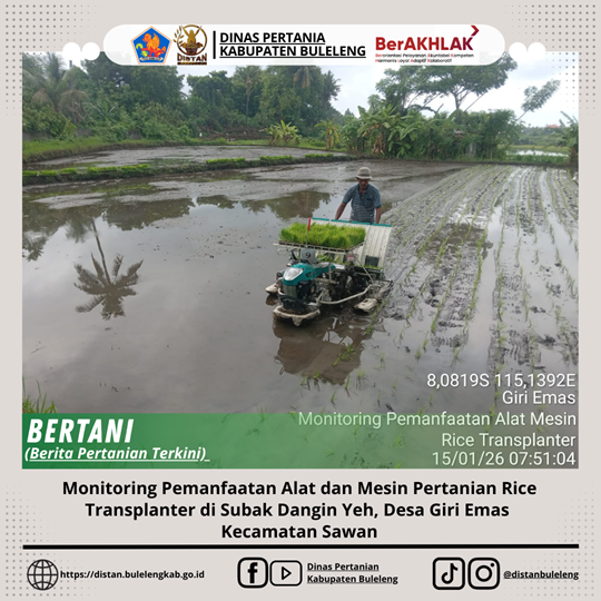 Pada hari Kamis, 15 Januari 2025, telah dilaksanakan kegiatan Monitoring Pemanfaatan Alat dan Mesin Pertanian Rice Transplanter yang berlokasi di Subak Dangin Yeh, Desa Giri Emas, Kecamatan Sawan, tepatnya di lahan milik I Wayan Dinasa, selaku Kelian Subak Dangin Yeh, dengan luas lahan olah sekitar 25 are. Kegiatan ini dilaksanakan oleh JF Pengawas Alat dan Mesin Pertanian, Penata Layanan Operasional, serta Operator Layanan Operasional Bidang PSP, dan didampingi oleh Penyuluh Pertanian Desa Giri Emas. Monitoring ini merupakan bagian dari upaya pembinaan dan pengawasan pemanfaatan alsintan bantuan pemerintah agar dapat digunakan secara optimal, tepat guna, dan berkelanjutan oleh kelompok tani.