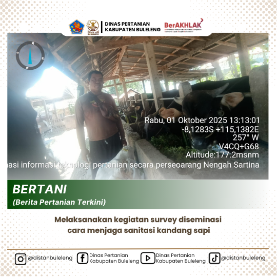Pada hari Rabu, 1 Oktober 2025, melaksanakan kegiatan survey sekaligus memberikan diseminasi cara menjaga sanitasi kandang sapi secara perseorangan kepada Bapak Nengah Sartina yang saat ini memelihara sapi 15 ekor sapi jantan dan 7 ekor sapi jantan di titip di kandang koloni Simantri 330 Desa Poh Bergong, Sanitasi kandang sapi adalah kegiatan menjaga kebersihan kandang dan lingkungannya untuk mencegah penyebaran penyakit, yang meliputi pembersihan kotoran secara rutin, pencucian dan desinfeksi lantai serta peralatan, menjaga kebersihan ternak, serta memastikan ventilasi yang baik dan sinar matahari masuk ke kandang. Tujuannya adalah menciptakan lingkungan sehat bagi sapi dan pemiliknya, memastikan kesehatan hewan, dan mendukung produktivitas peternakan.