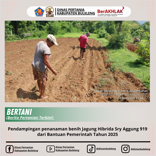 Pada hari ini, Senin 24 Nopember 2025, berlokasi di Subak Abian Melanting Kauh Desa Kubutambahan, petugas Penyuluh Pertanian Wilbin Kubutambahan melakukan pendampingan dalam penanaman benih Jagung Hibrida Sry Aggung 919 dari Bantuan Pemerintah Tahun 2025. Penanaman ini dilakukan di Lahan Bapak Made Redita sebagai anggota Subak Abian Melanting Kauh dengan Luas Lahan yaitu 0,45 ha.