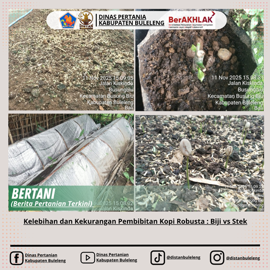 Kopi Robusta (Coffea canephora) merupakan komoditas unggulan yang banyak dibudidayakan di berbagai daerah di Indonesia, termasuk di Kecamatan Busungbiu, Kabupaten Buleleng, Bali. Untuk menghasilkan tanaman kopi yang produktif dan berkualitas, salah satu faktor penting yang perlu diperhatikan adalah proses pembibitan. Di Busungbiu, petani umumnya membuat bibit untuk batang bawah dari entres BP308 yang kemudian disambung dengan klon unggul sebagai batang atasnya. Pembibitan kopi Robusta dapat dilakukan dengan dua metode utama, yaitu melalui biji dan stek. Masing-masing metode ini memiliki kelebihan dan kekurangannya sendiri, yang perlu dipahami oleh petani agar dapat memilih teknik yang paling sesuai dengan kondisi dan tujuan budidaya mereka.
