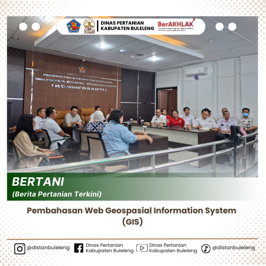 Pada Rabu, (13/08) telah dilaksanakan pertemuan teknis terkait pembahasan web GIS. Pertemuan dilaksanakan di ruang Buleleng Command Center (BCC) Dinas Kominfosanti yang juga dihadiri langsung oleh pihak ketiga (PT. Bara Kusuma). Dalam pertemuan tersebut, Dinas Pertanian diwakili oleh Sekretaris Dinas Pertanian didampingi staf bidang PSP.