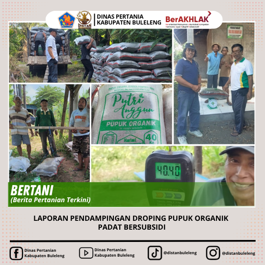 Hari ini dilaksanakan droping Pupuk Organik Padat bersubsidi sejumlah 120 ton di Desa Tukad Sumaga, Desa Tinga-tinga dan Desa Pemuteran. PPL wilbin melakukan pendampingan langsung ke lapangan. Tahun ini alokasi Pupuk Organik Padat bersubsidi untuk kecamatan Gerokgak adalah 281.5 ton. Semakin tingginya kesadaran petani dalam mengaplikasikan pupuk organik, diharapkan dapat meningkatkan produksi padi, jagung, cabai, anggur dan produk sayuran yang lainnya.