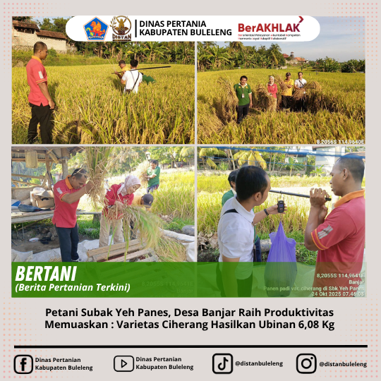 Kegiatan panen ini dilaksakan oleh Kelian Subak, Petani, staf BPP Banjar, Petugas Data dan PPL Wilbin Desa Banjar, sebagai bentuk dukungan dan monitoring terhadap keberhasilan pola tanam yang diterapkan oleh Petani dan pendampingan oleh PPL Wilbin Desa Banjar.