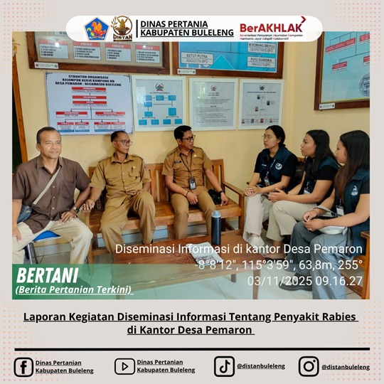 Pada hari Senin, 3 November 2025 telah dilaksanakan kegiatan Diseminasi Informasi tentang Penyakit Rabies yang bertempat di Kantor Desa Pemaron, Kecamatan Buleleng. Kegiatan ini dilaksanakan oleh Penyuluh Pertanian Kecamatan Buleleng wilayah binaan Desa Pemaron dengan melibatkan aparat Desa Pemaron serta mahasiswa Kuliah Kerja Nyata (KKN) dari Institut Mpu Kuturan Singaraja.
