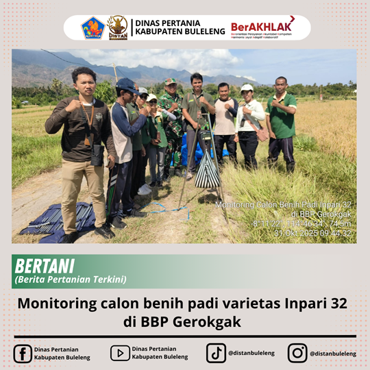 Jumat, 31 Oktober 2025 dilaksanakan monitoring calon benih padi varietas Inpari 32 di BBP Gerokgak. Hadir Bidang Tanaman Pangan, PP Ahli Madya, PPL Wilbin, POPT Kecamatan Gerokgak dan Petugas Data. Monitoring kali ini berbarengan dengan pengambilan ubinan oleh BPS pada segmen Kerangka Sampel Area (KSA) yang salah satunya jatuh di lahan Subak Rete, Desa Gerokgak, Kecamatan Gerokgak (lahan Balai Benih).