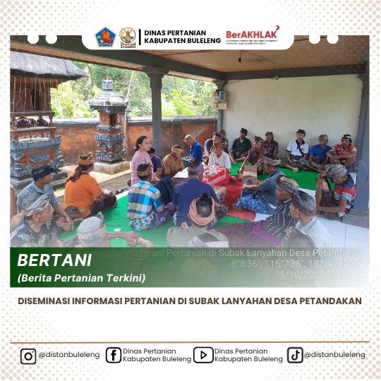 Pada hari Minggu, 5 Oktober 2025, bertempat di Balai Subak Lanyahan Desa Petandakan, PPL wilbin Petandakan menghadiri pertemuan kelompok/ sangkepan Subak di Subak Lanyahan Desa Petandakan dalam rangka diseminasi informasi pertanian tentang Pemupukan Berimbang untuk Komoditas Padi dan Pendampingan Penyusunan RDKK Pupuk Bersubsidi untuk komoditas padi Tahun 2026. Kegiatan hari ini dihadiri oleh kelian subak, pengurus subak serta anggota subak Lanyahan.