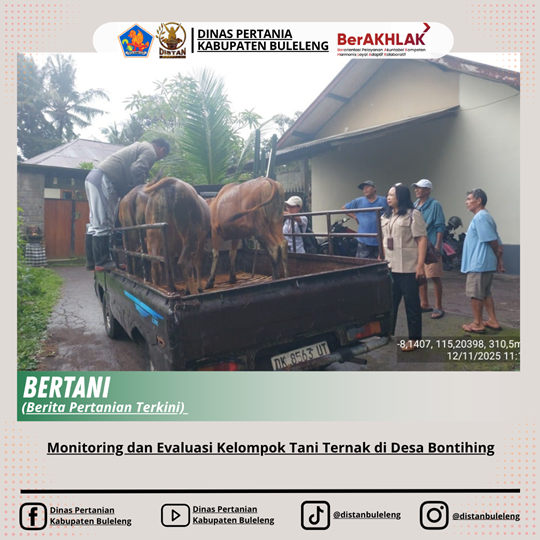 Hari Rabu, 12 November 2025, Tim Monitoring dan Evaluasi (Monev) dari Bidang Peternakan dan Kesehatan Hewan Dinas Pertanian Kabupaten Buleleng diantaranya Kepala Bidang PKH, Pengawas Sanitasi Uspet dan Kesmavet serta Pengawas bibit ternak telah melaksanakan kegiatan monev terhadap Kelompok Tani Ternak (KTT) Suchi Berkarya, yang berlokasi di Banjar Dinas Kanginan, Desa Bontihing, Kecamatan Kubutambahan selaku penerima dana hibah APBD Perubahan Tahun 2025