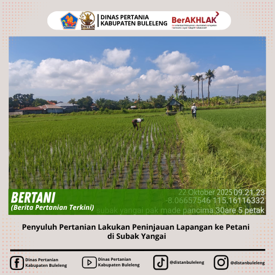 Hari ini, Rabu 22 Oktober 2025 PPL Wilbin Desa Bungkulan melakukan peninjauan lapangan di wilayah binaan terkait keadaan pertanaman di Subak Yangai. Pada musim tanam III kali ini sudah dilakukan penanaman seluas 48 ha dengan varietas inpari 32 berkisar 14 -28 HST. Kegiatan ini rutin dilakukan untuk mengetahui keadaan pertanaman Padi di wilayah kerja. Dalam hasil peninjauan lapangan sampai saat ini keadaan pertanaman masih dalam kondisi yang baik namun dalam melaksanakan budidaya ditemukan permasalahan antara lain adalah tumbuhnya gulma disekitar pertanaman padi. Salah satu tindakan yang telah dilakukan adalah pengendalian gulma secara