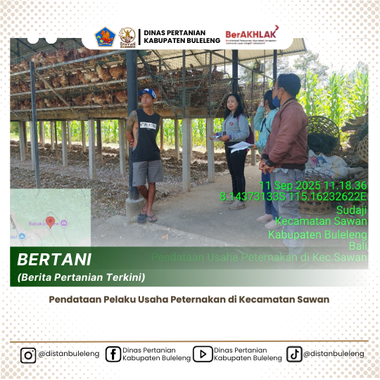 Kamis, 11 September 2025 dilakukan kegiatan pendataan usaha peternakan di Kecamatan Sawan oleh Bidang Peternakan dan Kesehatan Hewan Dinas Pertanian Kabupaten Buleleng bersama Dokter Hewan Puskeswan Kecamatan Sawan. Pendataan dilakukan untuk mendata pelaku Usaha Peternakan di Kecamatan Sawan, mengetahui Jumlah ternak yang dipelihara dan produksi sehingga dapat diketahui data populasi, dan produksi protein hewani di Kecamatan Sawan.