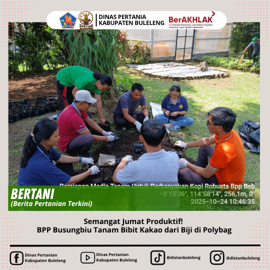 Busungbiu, 24 Oktober 2025 — Seluruh karyawan Balai Penyuluhan Pertanian (BPP) Busungbiu melaksanakan kegiatan pembuatan bibit kakao dari biji dengan menggunakan media polybag. Kegiatan yang dilaksanakan pada hari Jumat, 24 Oktober 2025 ini berlangsung di halaman kantor BPP Busungbiu dan diikuti secara antusias oleh seluruh pegawai sebagai bagian dari kegiatan peningkatan pengetahuan dan keterampilan teknis budidaya tanaman perkebunan, khususnya kakao.