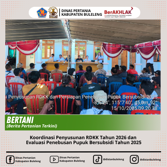 Hari ini, rabu 15 Oktober 2025 telah dilaksanakan koordinasi percepatan penyusunan RDKK tahun 2026 dan evaluasi penebusan pupuk bersubsidi tahun 2025 bersama Koordinator BPP Sawan, Tim Verval Kecamatan Sawan, Tim RDKK Sawan, PPL se-Kecamatan Sawan, Produsen PT Pupuk Indonesia, Distributor PT PPI dan 68 Kelian Subak se- Kecamatan Sawan. Kegiatan ini dilaksanakan sebagai tidak lanjut rapat yang telah dilaksanakan pada 16 September 2025 melalui Bidang PSP terkait Penyusunan RDKK Tahun 2026 dan Evaluasi Penebusan Pupuk Bersubsidi Tahun 2025 dan Monev tanggal 06 Oktober 2025 dari Dinas Pertanian dan Ketahanan Pangan Provinsi Bali bersama Bidang PSP Dinas Pertanian Kabupaten Buleleng dalam pendataan RDKK untuk pupuk bersubsidi di BPP Kecamatan Sawan. Adapun hal yang dibahas pada saat pertemuan antara lain :