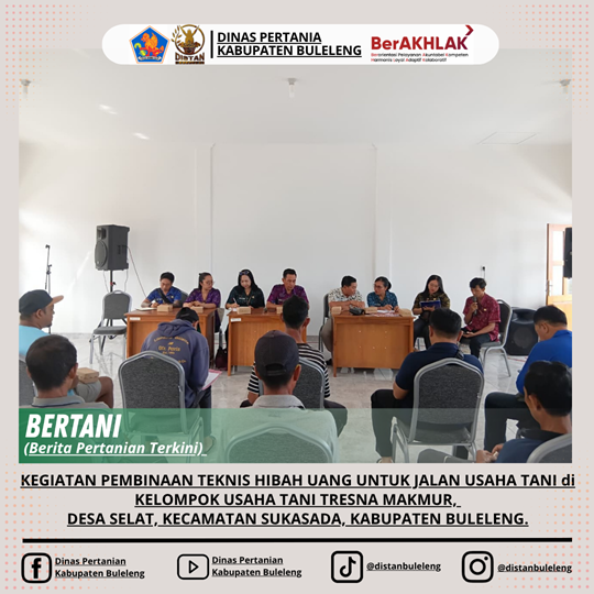 Pada hari Selasa, 11 November 2025, telah dilaksanakan Rapat Pembinaan Teknis Kegiatan Hibah Uang untuk Jalan Usaha Tani di Kelompok Usaha Tani Tresna Makmur, Desa Selat, Kecamatan Sukasada, Kabupaten Buleleng. Kegiatan ini diselenggarakan oleh Dinas Pertanian Kabupaten Buleleng di Kantor Perbekel Desa Selat dengan tujuan memberikan pembinaan teknis dan pemahaman kepada Kelompok Penerima Bantuan terkait pelaksanaan kegiatan hibah uang agar berjalan sesuai pedoman, tepat sasaran, dan transparan.