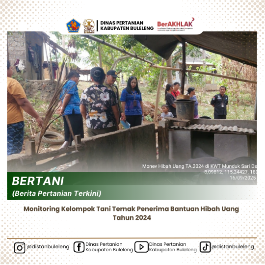 Pada hari ini, selasa 16 September 2025 Kepala Dinas Pertanian Kabupaten Buleleng melaksanakan monitoring dan evaluasi kelompok tani/ternak penerima bantuan hibah uang tahun anggaran 2024, didampingi langsung oleh Kepala Bidang Peternakan dan Kesehatan Hewan, Pengawas Sanitasi Uspet dan Kesmavet, serta Koordinator dan PPL dari BPP Kecamatan Kubutambahan dan Kecamatan Tejakula