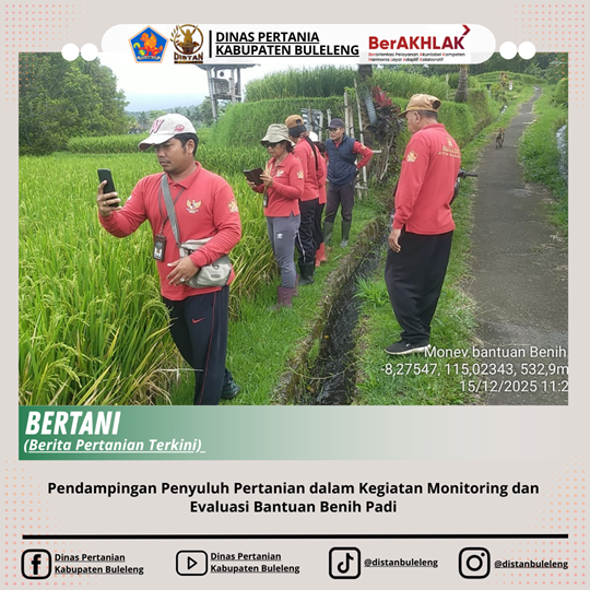 Pendampingan penyuluh pertanian dalam kegiatan monitoring dan evaluasi bantuan benih padi dilaksanakan pada hari Senin, 15 Desember 2025, bertempat di Subak Bengkel, Desa Bengkel dan Subak Sri Utami Giri, Desa Pelapuan, Kecamatan Busungbiu. Kegiatan ini bertujuan untuk mengetahui secara langsung pelaksanaan penyaluran serta pemanfaatan bantuan benih padi oleh petani, sekaligus menilai kesesuaian antara perencanaan program dengan kondisi di lapangan. Monitoring dan evaluasi dilakukan dengan peninjauan areal pertanaman padi, pemeriksaan jenis dan kualitas benih yang digunakan, serta diskusi bersama petani terkait pertumbuhan tanaman dan kendala yang dihadapi selama proses budidaya. Dalam kegiatan ini, penyuluh pertanian berperan aktif melakukan pendampingan teknis, memberikan arahan budidaya yang sesuai, serta menjembatani komunikasi antara petani dengan pihak terkait. Kegiatan tersebut dihadiri oleh Kepala Bidang Tanaman Pangan beserta staf, Koordinator BPP Kecamatan Busungbiu, PPL Wilayah Binaan Bengkel dan Pelapuan, serta Kelian Subak setempat, yang bersama-sama melakukan evaluasi dan tukar pendapat mengenai efektivitas bantuan benih padi. Dari hasil monitoring dan evaluasi diketahui bahwa bantuan benih padi telah diterima dan dimanfaatkan oleh petani sesuai peruntukannya, meskipun masih terdapat beberapa kendala teknis yang memerlukan pendampingan dan tindak lanjut. Melalui kegiatan ini diharapkan sinergi antara petani, penyuluh pertanian, dan instansi terkait semakin kuat sehingga program bantuan benih padi dapat memberikan manfaat optimal dalam meningkatkan produksi dan kesejahteraan petani di Kecamatan Busungbiu.