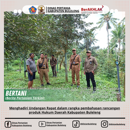 Senin, 8 Desember 2025, Petugas PP Ahli Muda, PP Ahli Pertama, Pengadministrasi Perkantoran Bidang Hortikultura bersama Koordinator PP Kec. Kubutambahan dan PPL Wilbin Desa Tamblang dan Tambakan melaksanakan cek lokasi persiapan kunjungan lapang (Fieldtrip) Kegiatan HDDAP.