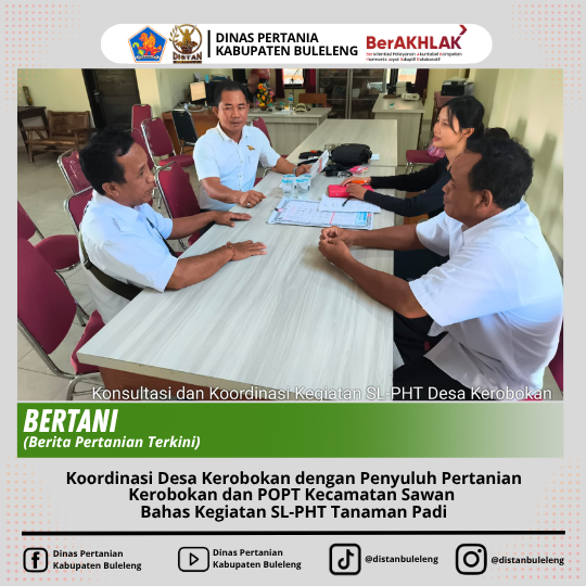 Hari ini, Rabu 8 Oktober 2025, Pemerintah Desa Kerobokan melaksanakan kegiatan koordinasi dan konsultasi dengan Penyuluh Pertanian Lapangan (PPL) Desa Kerobokan serta Pengendali Organisme Pengganggu Tumbuhan (POPT) Kecamatan Sawan terkait pelaksanaan Sekolah Lapang Pengendalian Hama Terpadu (SL-PHT) pada komoditas tanaman padi. Koordinasi yang berlangsung di Kantor Desa Kerobokan dilaksanakan bersama Kepala Desa Kerobokan, Kaur Pemerintahan Desa Kerobokan, Koordinator BPP Sawan sekaligus PPL Desa Kerobokan dan POPT Kecamatan Sawan.