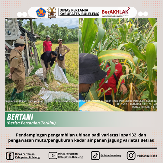 1. Pendampingan pengambilan ubinan padi varietas Inpari32 di Subak Menagung, Desa Kayuputih, Kecamatan Banjar. Pengambilan ubinan di lahan milik Kadek Suyasa seluas 25 Are, oleh 3 Penata Layanan Operasional bidang Tanaman Pangan, PPL Wilbin Desa Kayuputih, Kelian Subak dan petani. Tujuan utama pengambilan ubinan padi adalah untuk memperkirakan secara akurat produktivitas dan potensi hasil panen per hektar (ton/ha), membantu perencanaan panen, menentukan harga gabah yang wajar, mengevaluasi teknologi pertanian, dan memberikan data produksi bagi pemerintah untuk ketahanan pangan. Ini memberikan informasi nyata tentang hasil panen sehingga petani tidak mudah tertipu dalam sistem jual borongan, serta memotivasi peningkatan hasil melalui pengelolaan lahan yang lebih baik. Sistem pengambilan ubinan dilakukan dengan mengambil 1 titik sampel dengan ukuran 2,5m x 2,5m. Hasil dari pengambilan ubinan di Subak Menagung, sebagai berikut :