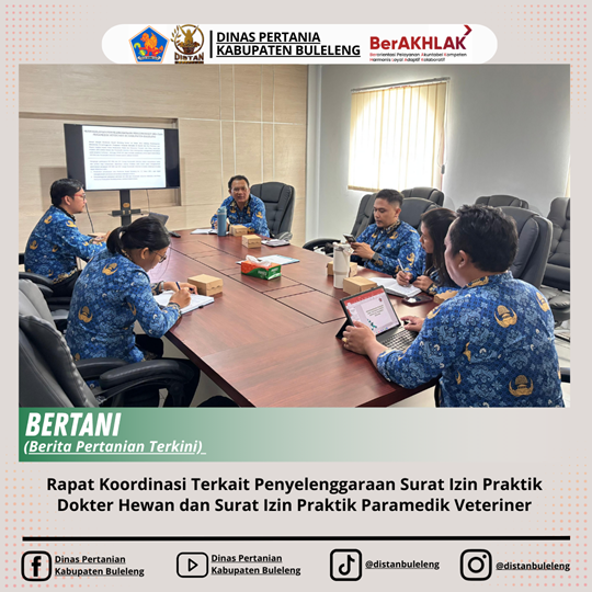 Pada hari ini, Senin, 1 Desember 2025, Dinas Pertanian Kabupaten Buleleng melalui Medik Veteriner Bidang Peternakan dan Kesehatan Hewan menghadiri undangan rapat terkait pembahasan Surat Izin Praktik Dokter Hewan (SIP DRH) dan Surat Izin Praktik Paramedik Veteriner (SIPP Veteriner). Rapat ini dilaksanakan di Ruang Rapat Prioritas Mal Pelayanan Publik (MPP) Kabupaten Buleleng.