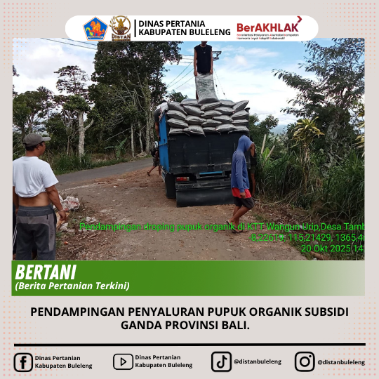 Pada hari ini, senin 20 oktober 2025, kegiatan pendampingan penyaluran pupuk organik subsidi ganda dari Pemerintah Provinsi Bali. penyaluran ini di lansung diterima oleh kelompok tani / subak abian yang mengajukan pengadaan melalui cpcl yang disusun oleh PPL di masing - masing wilbin di Kecamatan Kubutambahan. Pupuk organik subsidi ganda ini merupakan bantuan pemerintah Provinsi Bali dalam rangka peningkatan penggunaan pupuk organik oleh petani yang bertujuan untuk kelestarian lingkungan / lahan pertanian yang berkelanjutan serta menjaga unsur hara tanah pertanian yang semakin berkurang unsur - unsur organiknya. adapun tujuan penyaluran pupuk organik subsidi ganda oleh pemerintah provinsi Bali antara lain, Meningkatkan produktivitas pertanian, menjaga keberlanjutan usaha tani bagi petani kecil, mendukung ketahanan pangan nasional dan memperbaiki struktur tanah secara berkelanjutan. Tujuan lain dari subsidi ini ialah untuk membuat pupuk lebih terjangkau bagi petani, memastikan ketersediaanya secara optimal dan menjaga kualitas pupuk agar sesuai standar. semoga realisasinya pupuk organik subsidi ganda ini bermanfaat bagi petani di kecamatan kubutambahan.