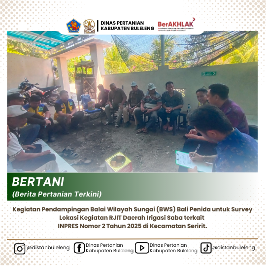 Pada hari Selasa, 23 September 2025 Dalam rangka percepatan pelaksanaan Instruksi Presiden (Inpres) Nomor 02 Tahun 2025 tentang Pembangunan dan Rehabilitasi Jaringan Irigasi Tersier (RJIT), Tim Kabupaten Dinas Pertanian Kabupaten Buleleng yang diwakili oleh JF Analis PSP, Ida Putu Sandiasa, SP, bersama staf Bidang PSP melaksanakan pendampingan survei lokasi bersama Balai Wilayah Sungai (BWS) Bali Penida dan subak-subak penerima bantuan kegiatan di Daerah Irigasi Saba, Kecamatan Seririt. Kegiatan ini bertujuan untuk sosialisasi awal sekaligus mitigasi pelaksanaan agar tidak menimbulkan permasalahan di kemudian hari, terutama yang dapat berdampak pada keberlanjutan pertanaman padi di musim tanam III. Usulan kegiatan tersebut sebelumnya telah disampaikan oleh Dinas Pertanian ke Kementerian Pertanian melalui aplikasi Sistem Informasi Pengusulan Irigasi (SIPURI).