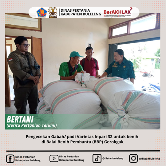Pada hari Kamis, 6 November 2025 telah dilaksanakan kegiatan pengecekan gabah/padi varietas Inpari 32 yang akan digunakan sebagai benih di Balai Benih Pembantu (BBP) Gerokgak. Kegiatan ini dilakukan bersama petugas dari Balai Pengawas dan Sertifikasi Benih (BPSB) Kabupaten Buleleng serta turut didampingi langsung oleh Ibu Sekretaris Dinas Pertanian Kabupaten Buleleng.