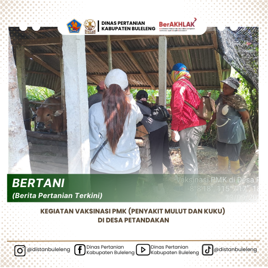 Dalam rangka untuk melindungi kesehatan ternak sapi dan mengantisipasi penyebaran kasus Penyakit Mulut dan Kuku (PMK) di Desa Petandakan maka Dinas Pertanian Kabupaten Buleleng melalui dokter hewan yang bertugas di Kecamatan Buleleng dan PPL Desa Petandakan menggelar Vaksinasi PMK yang rencananya diselenggarakan selama dua hari mulai hari ini Selasa, 23 September 2025 s/d Rabu, 24 September 2025. Vaksinasi PMK ini bisa diberikan pada sapi dengan kondisi :