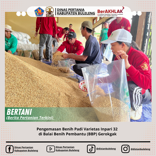 Pada hari Senin, 15 Desember 2025. Staf Bidang Penyuluhan Dinas Pertanian Kabupaten Buleleng melaksanakan kegiatan pengemasan benih padi varietas Inpari 32 di Balai Benih Pembantu (BBP) Gerokgak. Kegiatan ini merupakan salah satu tahapan penting dalam proses produksi benih untuk menjaga mutu dan daya tumbuh benih sebelum didistribusikan kepada petani.
